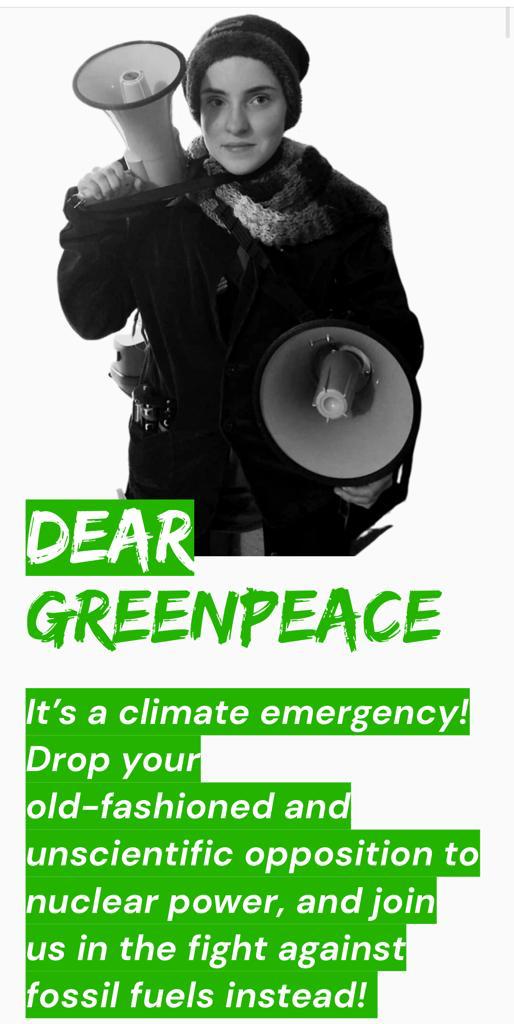 Además la joven comenzó una petición on line de firmas para que Greenpeace “adopte la energía nuclear y, en su lugar, se concentre en deshacerse de los fósiles”.