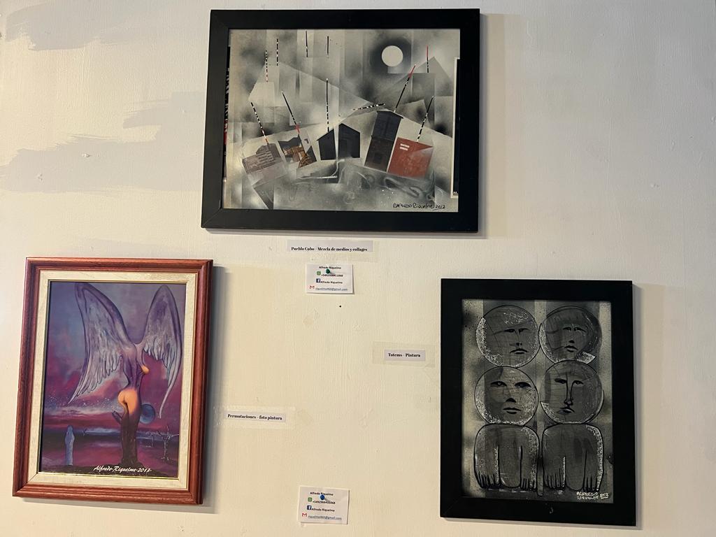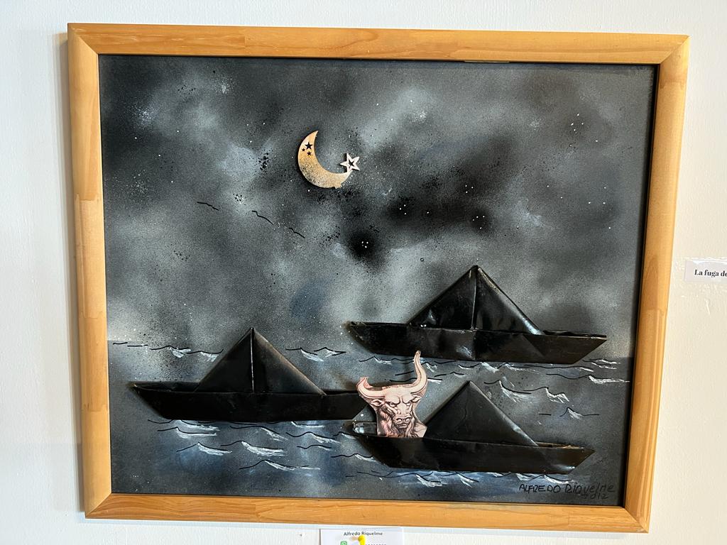 La puerta añeja de Ruiz introduce a los rostros fantasmagóricos, a la geometría y al cuerpo desnudo de un ángel alado que nos proporciona Riquelme. Hay más rostros de parte de Riquelme surgidos de entre las cenizas, propietarios de un secreto que se nos escapa. También barcos de papel teñidos a negro, bajo un cielo gris y a punto de emitir un grito; y cables y botellas, como manchados, como venidos de un futuro apocalíptico.