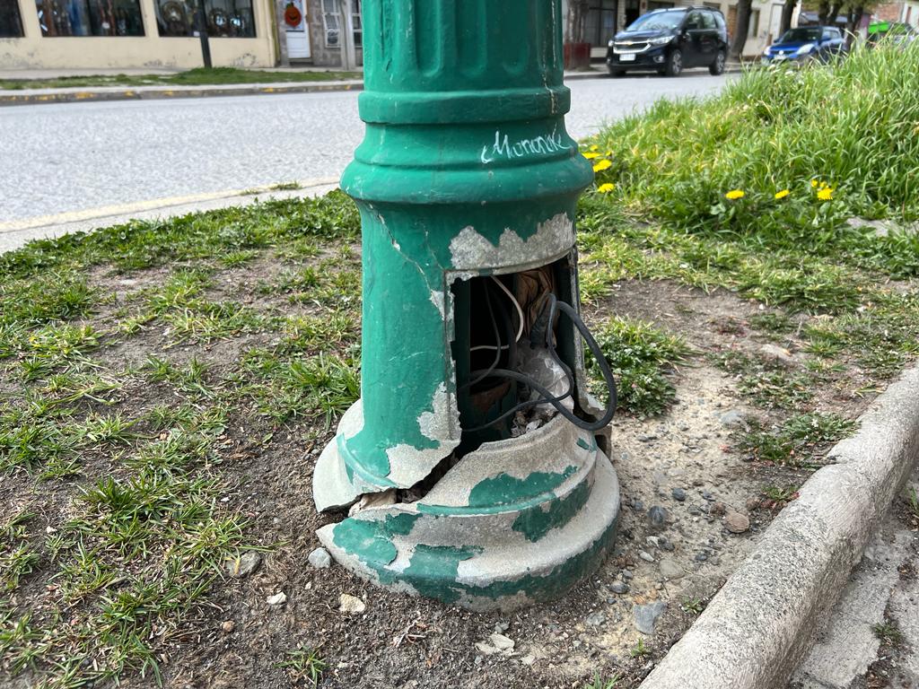 Entre las luminarias se evidencian focos quemados, sin repuestos, y postes que muestran el interior de sus bases abiertas, revelando un entramado de cables como si fueran las tripas de un organismo herido.