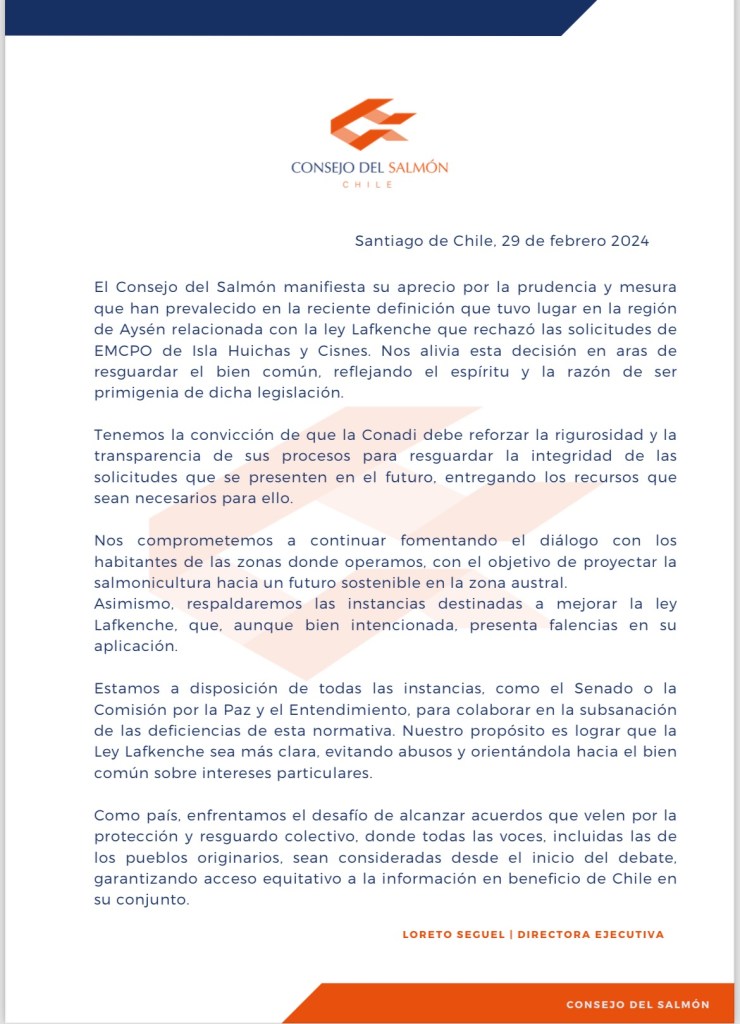 “El Consejo del Salmón manifiesta su aprecio por la prudencia y mesura que han prevalecido en la reciente definición que tuvo lugar en la región de Aysén relacionada con la ley Lafkenche que rechazó las solicitudes de EMCPO de Isla Huichas y Cisnes”, señaló en un comunicado Loreto Seguel, directora ejecutiva del Consejo del Salmón.