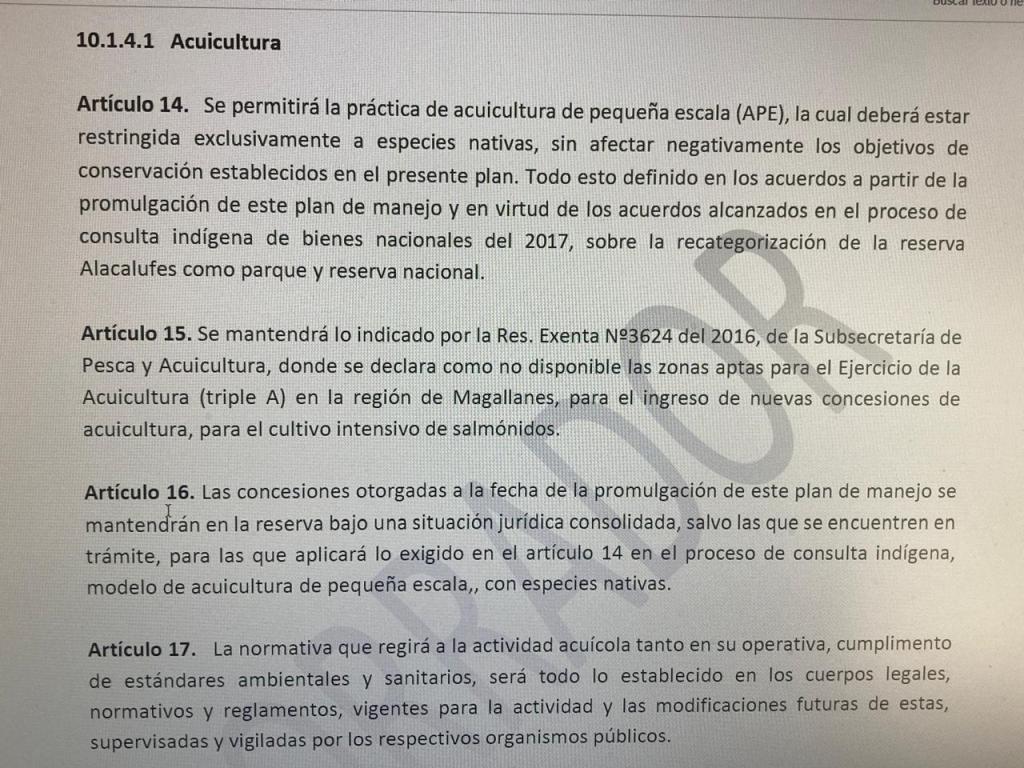 El artículo 14 del borrador indica: “Se permitirá la práctica de acuicultura de pequeña escala (APE), la cual deberá estar restringida exclusivamente a especies nativas, sin afectar negativamente los objetivos de conservación establecidos en el presente plan. Todo esto definido en los acuerdos a partir de la promulgación de este plan de manejo y en virtud de los acuerdos alcanzados en el proceso de consulta indígena de bienes nacionales del 2017, sobre la recategorización de la reserva Alacalufes como parque y reserva nacional”.