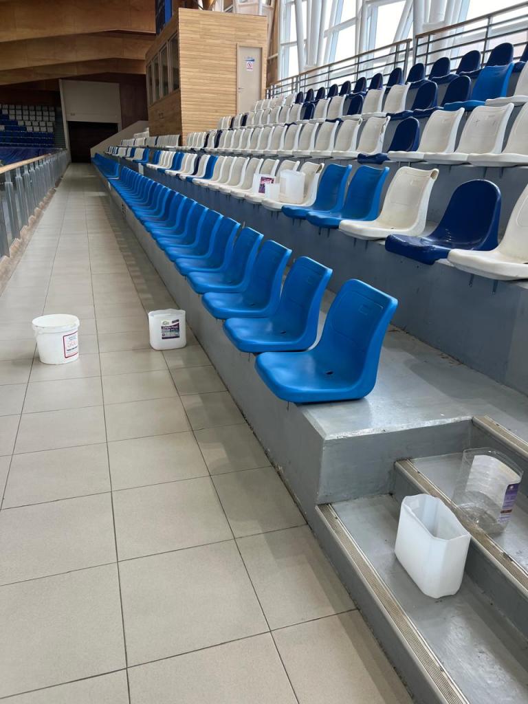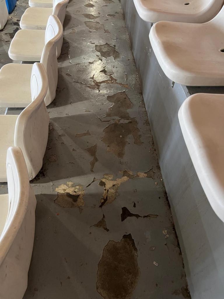Algunas de las columnas que sostienen la enorme estructura se observan degradadas por el paso del tiempo, faltas de pintura. En la zona de la cancha, en los pasillos internos que hay entre las butacas, predominan los pisos gastados y perforados por el agua.